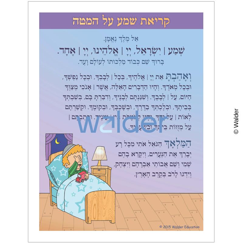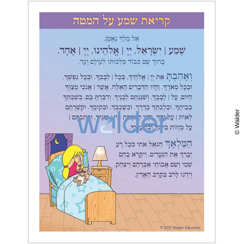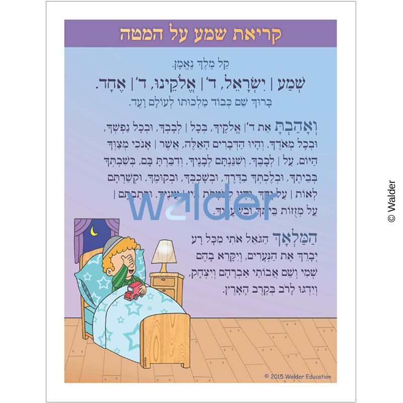 An illustrated Shema Yisroel Tefillah and Hamalach Hagoel sign. Students can use their creativity to adorn the sign with star stickers, or attach a swatch of material to be used for the blanket. They can then post it by their bed as a reminder to say nightly Kerias Shema. Please Note: This item contains sheimos, treat with care.