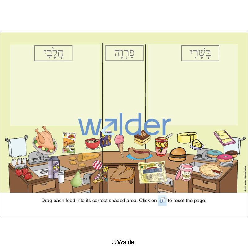 This interactive SmartBoard game reinforces students’ knowledge of the laws of kashrus (separating between milk, meat and parve foods) to keep a kosher kitchen. After learning about the different types of foods and the need to separate them, the students sort them into the correct section of the kitchen, either milk, meat or parve so that they do not mix. This SmartBoard game is a hands-on activity to learning and will allow students to test themselves and their knowledge of the kosher food categories.
