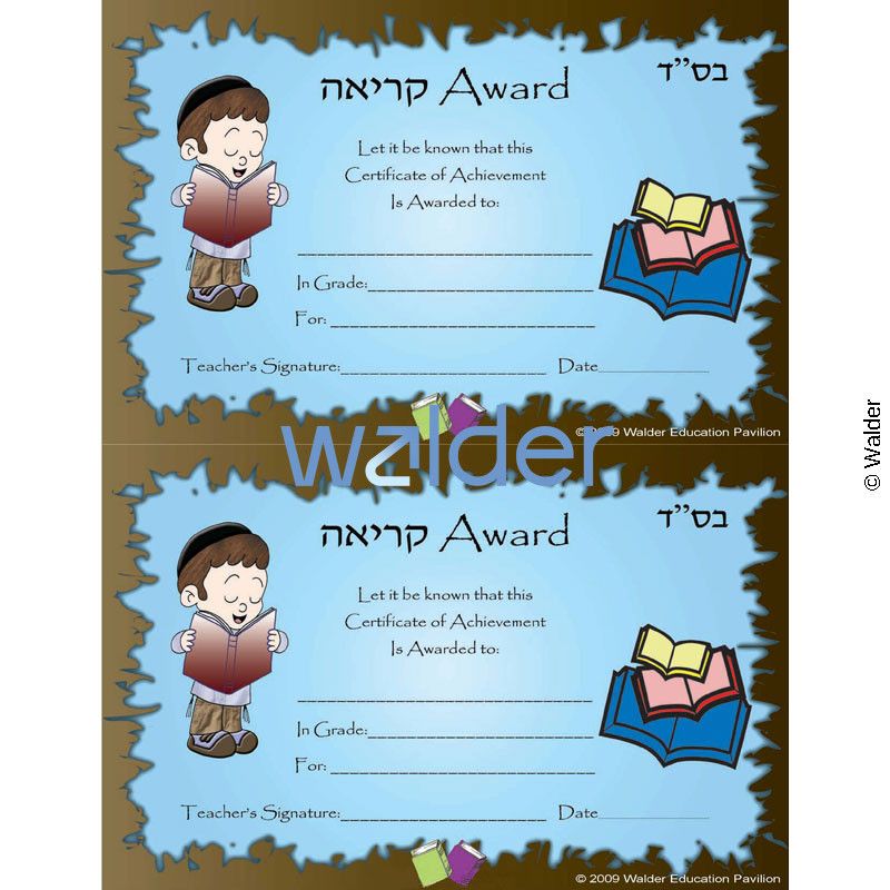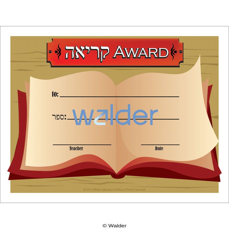 This certificate can be presented to boys as an award for excellence in keriah. It allows each student to receive individual recognition for his achievement. Upon receiving the award, the student will walk away imbued with a feeling of success.