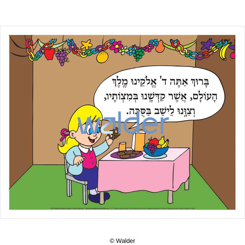 This colorful poster, showcasing a happy young girl enjoying a snack in a decorated sukkah, displays the text of the brachah of Leisheiv Basukkah. Hanging it on the wall will remind everyone to say this brachah before eating in the sukkah.