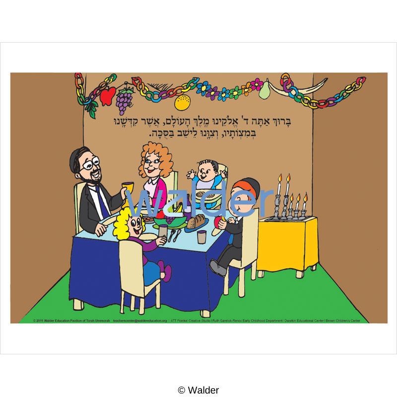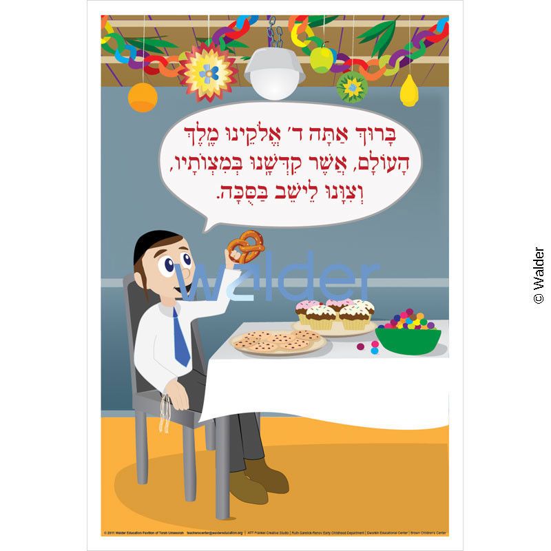 This colorful poster, depicts a little boy dressed in his yom tov best, sitting casually at a beautifully arranged table, about to enjoy a pretzel snack. He recites the brachah of Leisheiv Basukkah, which is clearly printed in a text balloon above his head.