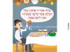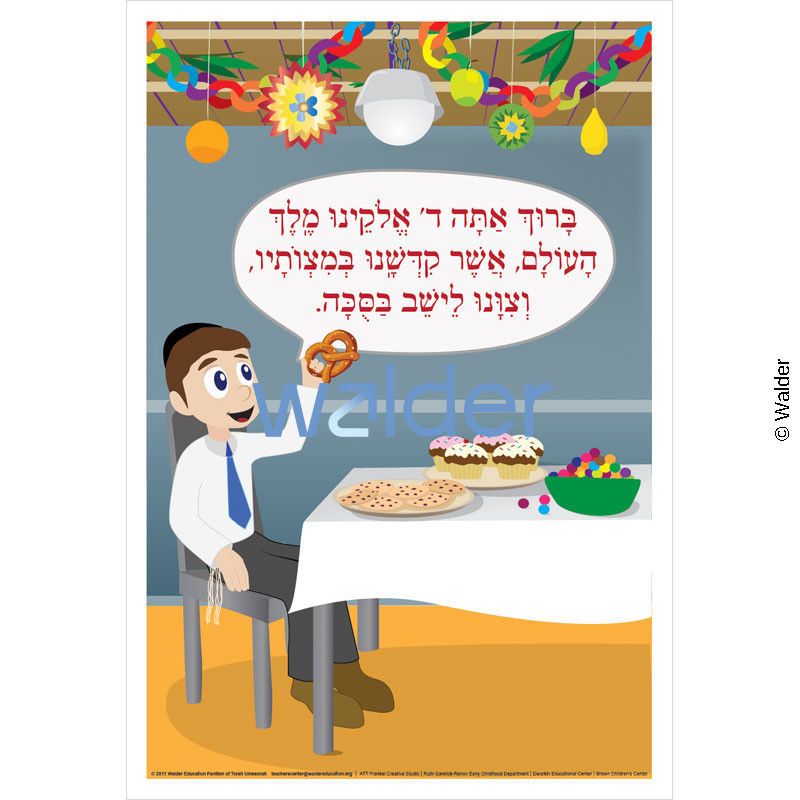 This colorful poster, depicts a little boy dressed in his yom tov best, sitting casually at a beautifully arranged table, about to enjoy a pretzel snack. He recites the brachah of Leisheiv Basukkah, which is clearly printed in a text balloon above his head.