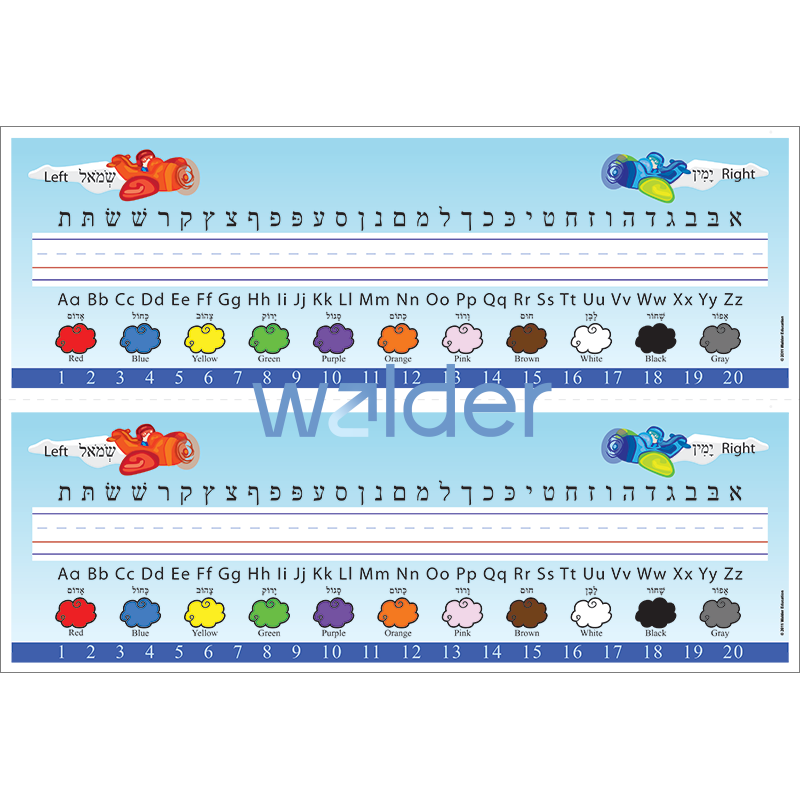 Reinforce student learning with these airplane-themed desk strips featuring the Hebrew alphabet in print, the English alphabet in upper and lower case, Hebrew and English names for common colors, the directions of left and right in English and Hebrew, and numerals from 1 to 20. Students can quickly reference this material as they develop reading and writing skills.