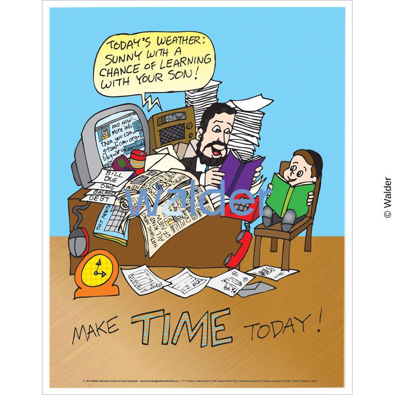 Poster featuring a picture of a father covered in paperwork learning with his son, a radio nearby has a speech bubble that reads ‘Today’s Weather: Sunny with a chance of learning with your son!’. A title along the bottom reads ‘Make TIME Today!’