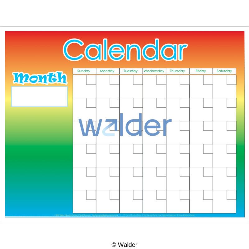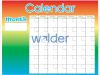 Poster featuring a calendar that has a multicolored background. It says ‘Calendar’ in large blue letters at the top. To the left is the word ‘Month’ with a white rectangle underneath it.