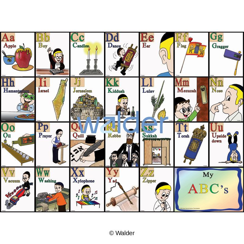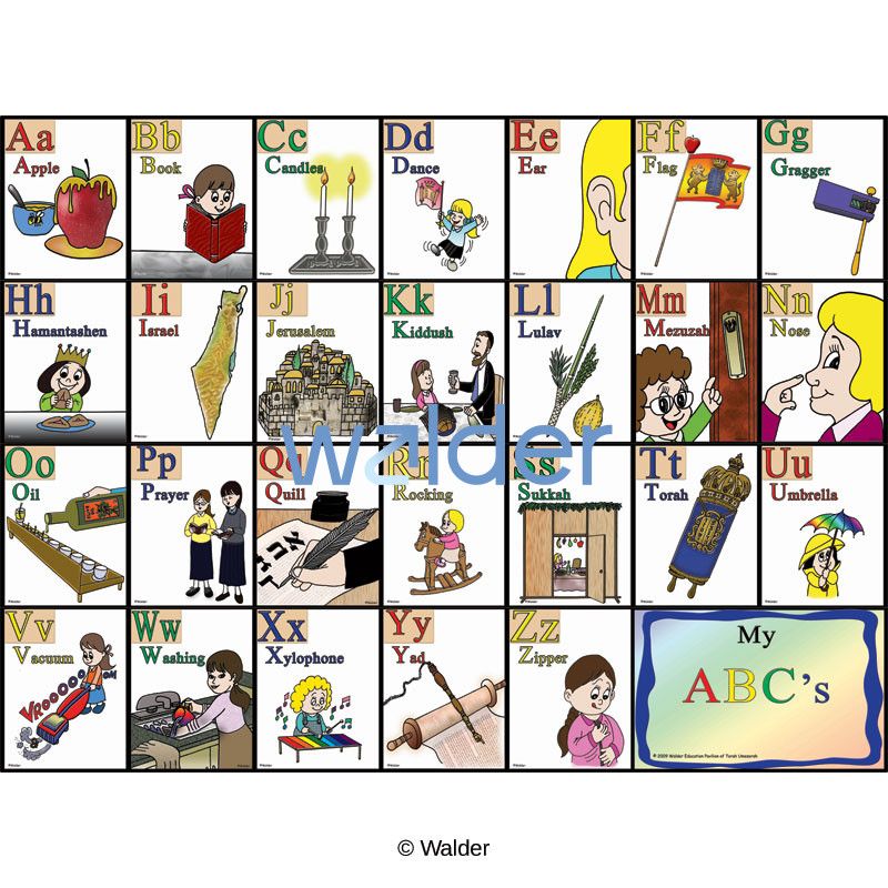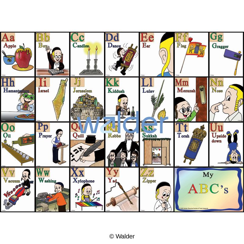 An ABC poster which includes Jewish-themed pictures associated with the initial phonetic sound of each letter.