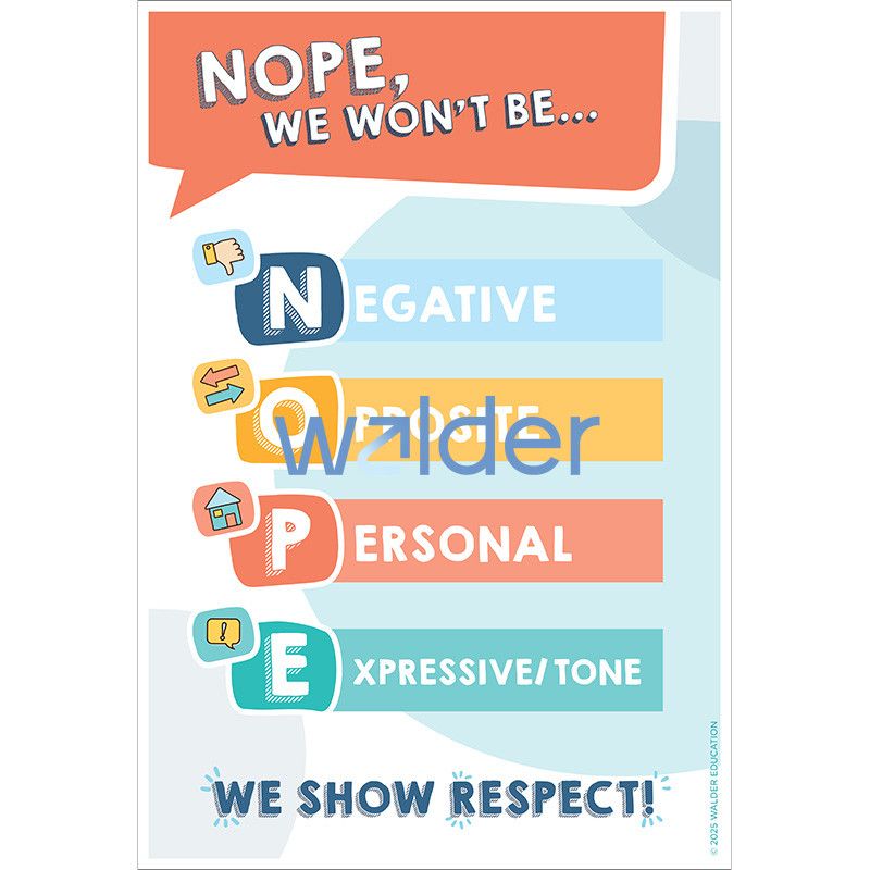 Reinforce respectful speech with this visually engaging poster that clearly illustrates the types of expression students should not use with their teachers: speech that is Negative, Opposite (contrary), overly Personal, or Expressive of sarcasm or mockery. The first letter of each type of expression forms the fitting acronym, NOPE. Use the poster as a visual cue to accompany lessons on derech eretz and to remind students of expectations for appropriate speech in the classroom.