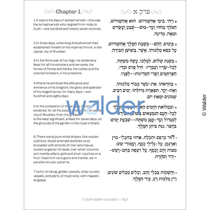 Help students master the Purim story with this comprehensive Megillas Esther booklet. The booklet features Hebrew text with nekudos and corresponding English translation on the right side of each page. The left side of the page includes room for notes and a black-and-white illustration based on the text. The spatial design allows students to easily see and focus on each pasuk while learning the Hebrew words and translation, as well as providing a visual reminder of the story’s progression, with ample room to add explanations or related divrei Torah.