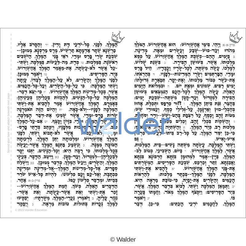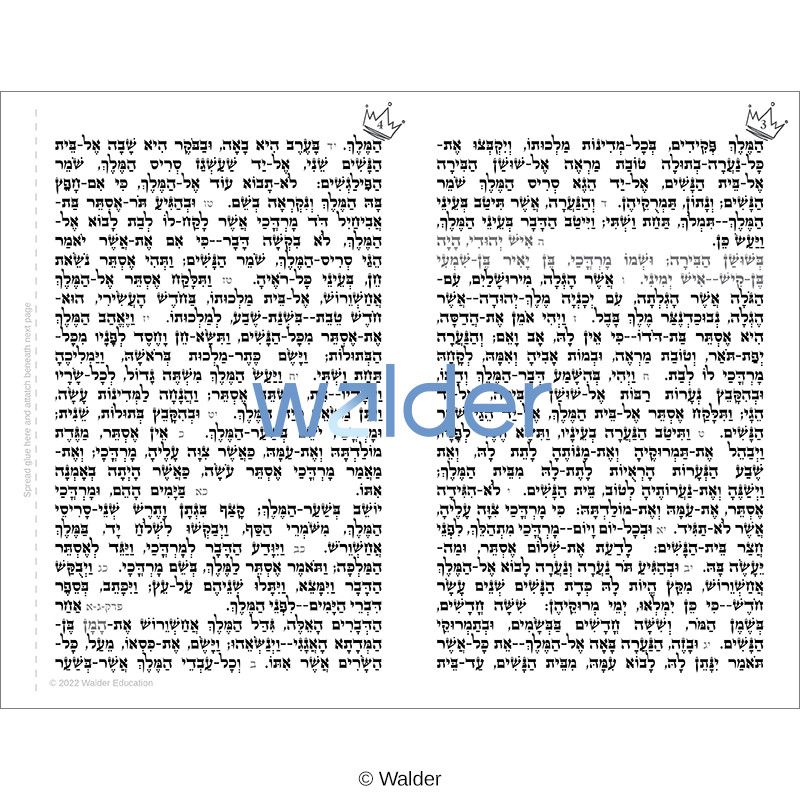 Upgrade your students’ appreciation for Megillas Esther and their ability to follow the reading with this Hamelech Version Megillah, which includes the complete Hebrew text with nekudos. Pesukim that are recited aloud and any mention of the name of Haman are indicated in the text for increased ease of use. The text is written in an authentic-looking Ksav Ashuris font style, similar to the font used in real scrolls, and is laid out according to the special Hamelech tradition, in which each column of the megillah begins with the word המלך except for the final few columns. To highlight this feature, each column is numbered with a crown icon, enhancing student awareness of the attention to detail required by a sofer. Add to the realistic look by printing the pages on parchment paper. The text is arranged so that students can use glue or double-sided tape to attach the pages together and roll them into a scroll.