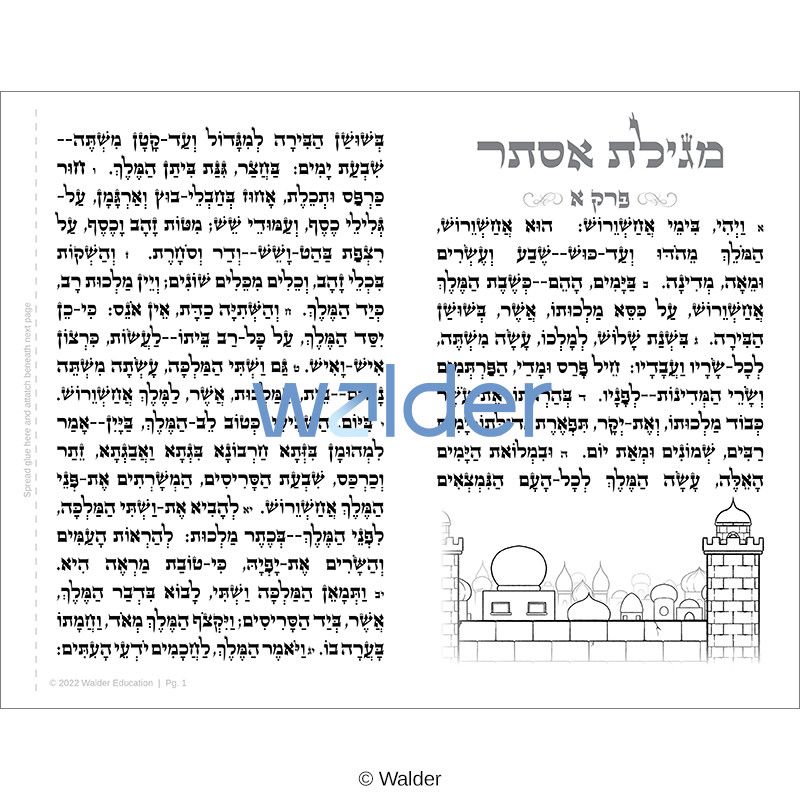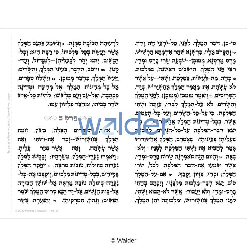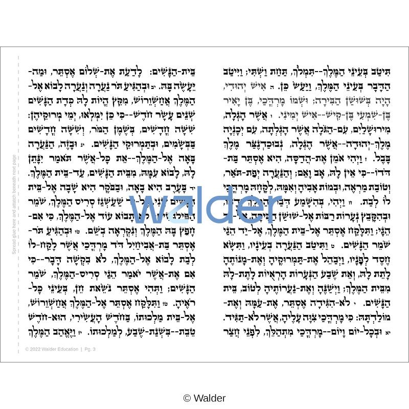 Upgrade your students’ appreciation for Megillas Esther with this scroll layout megillah, which features the complete Hebrew text. Clear chapter headings and nekudos make it easy for students to follow the reading or read the text themselves. Pesukim that are recited aloud are indicated in the text for increased ease of use. The text is written in an authentic-looking Ksav Ashuris font style, similar to the font used in real scrolls. To add to the realistic look, print the pages on parchment paper. The text is arranged so that students can attach the pages together using glue or double-sided tape and roll them into a scroll.
