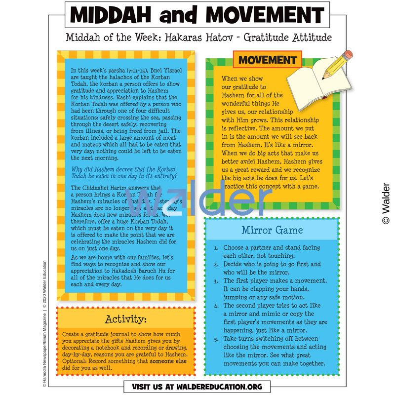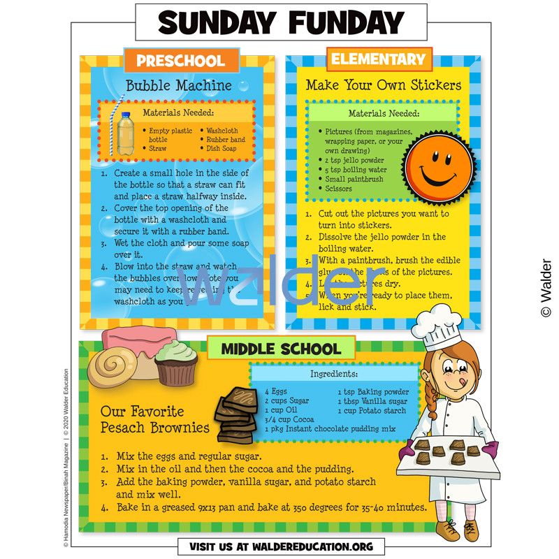 This week we focused on tips for dealing with fear and apprehension during this difficult time along with activities and ideas that help prepare for pesach. We included the middah of the week, having a gratitude attitude; fun activities like making pesach brownies, a bubble machine, and your own stickers; how to say the mah nishtana in multiple languages; projects for pesach four sons activities, hidden chametz finder, and Kosher LePesach signs; math activities for pesach an echad mi yodeia counting book, makkos math, and a galus and geulas Mitzraim timeline; science activities for parshas Tzav salt absorption and ramps; and parshas Tzav summary and dvar torah.