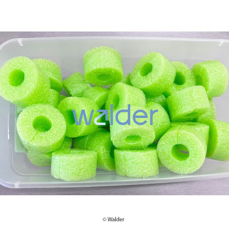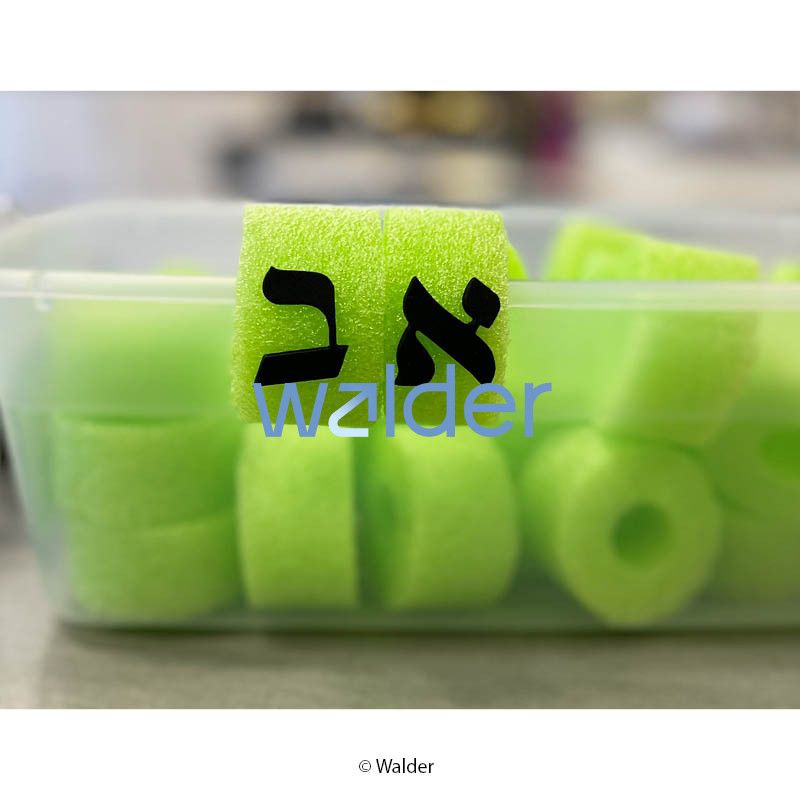 Each kit comes with 1 plastic container, 1 set of nekudos on clear gems with Velcro, and 1 set of 34 double-sided Hebrew letter pool noodle pieces.