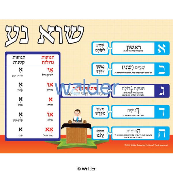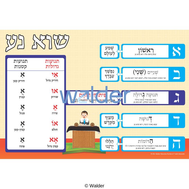 Dikduk sign featuring an image of a boy at a bimah in a talis reading from a Torah. To the right of the boy are the rules, in Hebrew, for when to pronounce a shva. To the left of the boy are the different vowels after which you do and do not pronounce the shva.