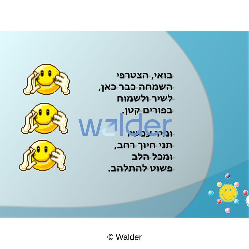 Students will compare temporal happiness with true joy, identify reasons for happiness mentioned in the Torah, and sing songs and use idioms related to joy. Students will check their knowledge by participating in a chidon.