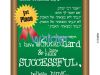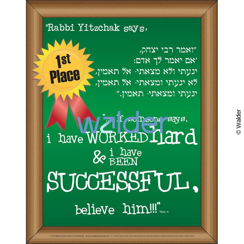 Poster featuring a blackboard that has a first place gold and red medal on it. In white lettering on the blackboard it says ‘Rabbi Yitzchak says, ‘???? ??? ???? ?? ???? ?? ??? ????? ??? ????? ?? ????? ?? ????? ?????? ?? ????? ????? ?????? ?????’ and then “… if someone says, I have worked hard & I have been successful, believe him!!!”