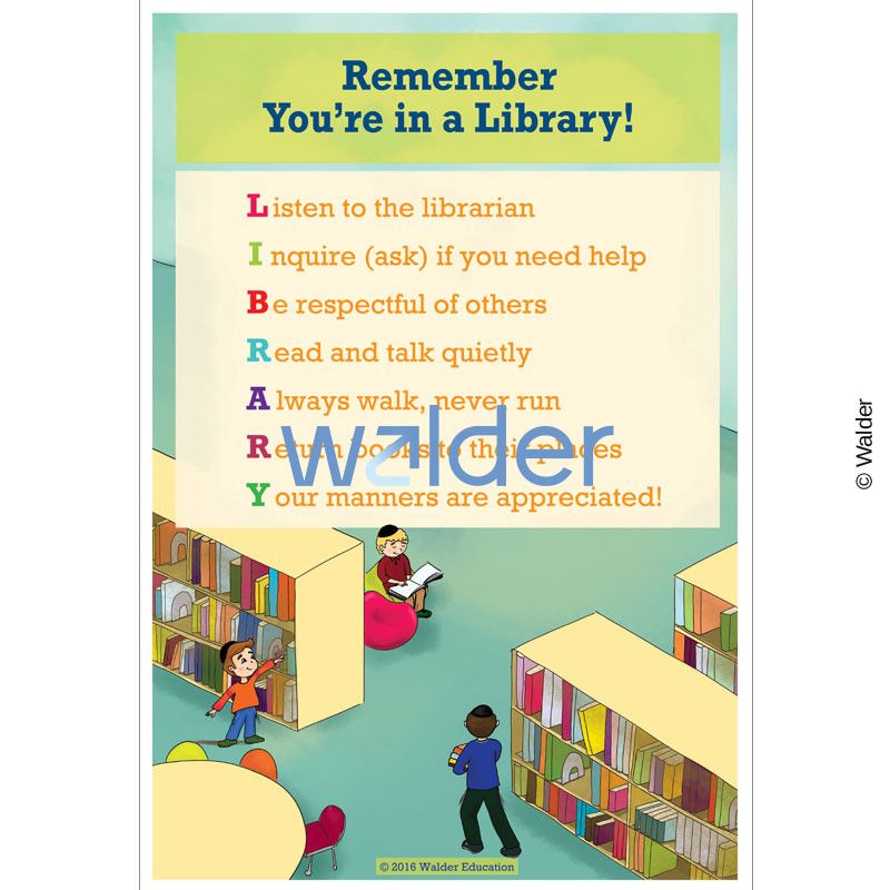 Remind students of the library rules with this mnemonic device that will brighten up your space. This colorful poster will set the tone for a productive and positive environment while telling students to; Listen to the librarian, Inquire (ask) if you need help, Be respectful of others, Read and talk quietly, Always walk never run, Return books to their places, and Your manners are appreciated.