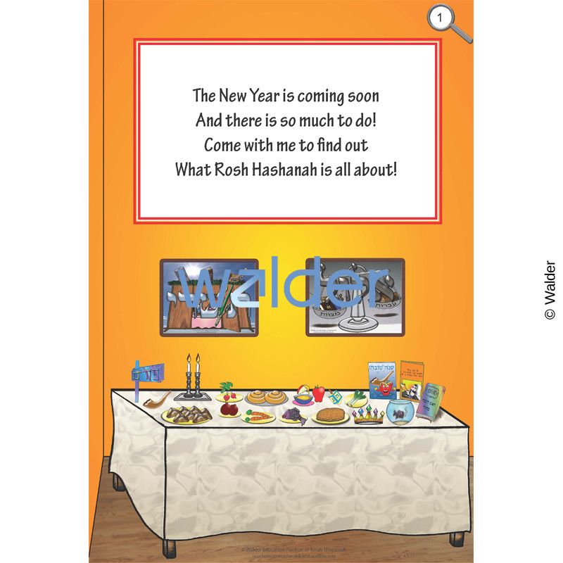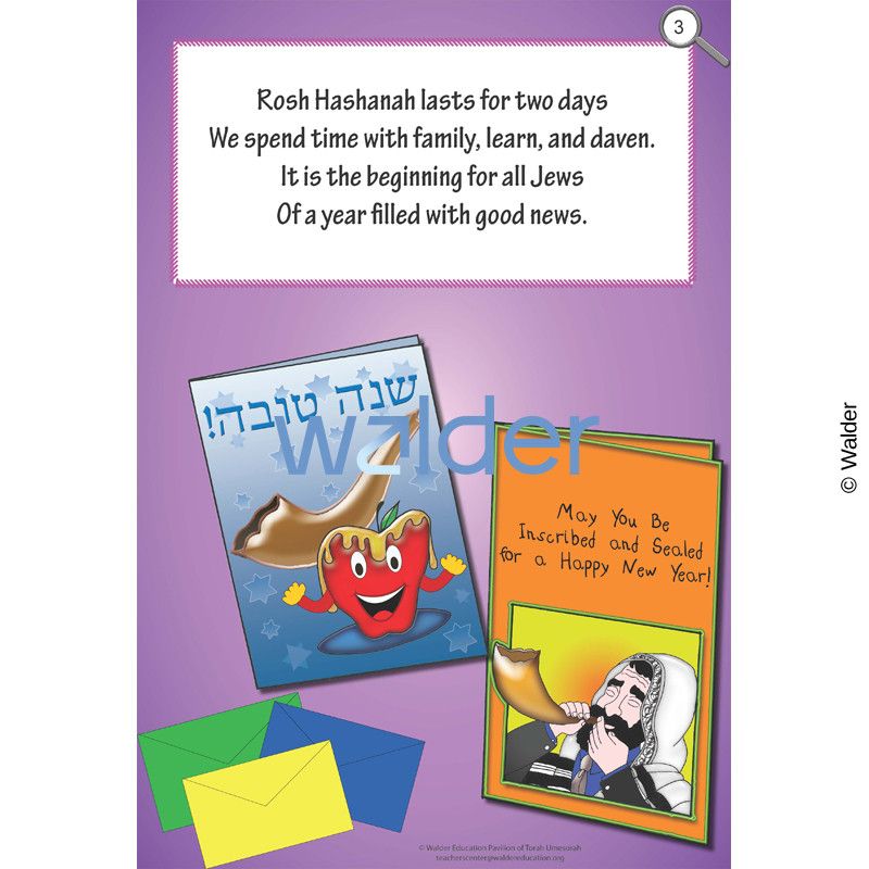 A colorful big book that sparks students’ curiosity and interest about the holiday of Rosh Hashanah and the objects associated with it. As each page is read, ask the students to find the items mentioned on the page. This book will surely keep their interest and focus. This big book is designed to be printed, laminated, and bound without any other preparation. This is part of the Rosh Hashanah Thematic Unit.