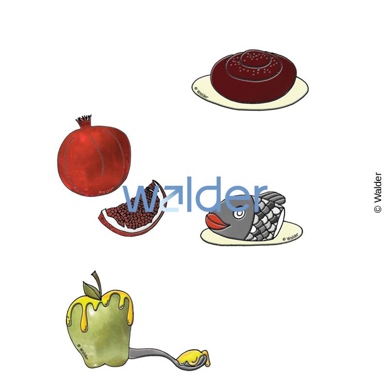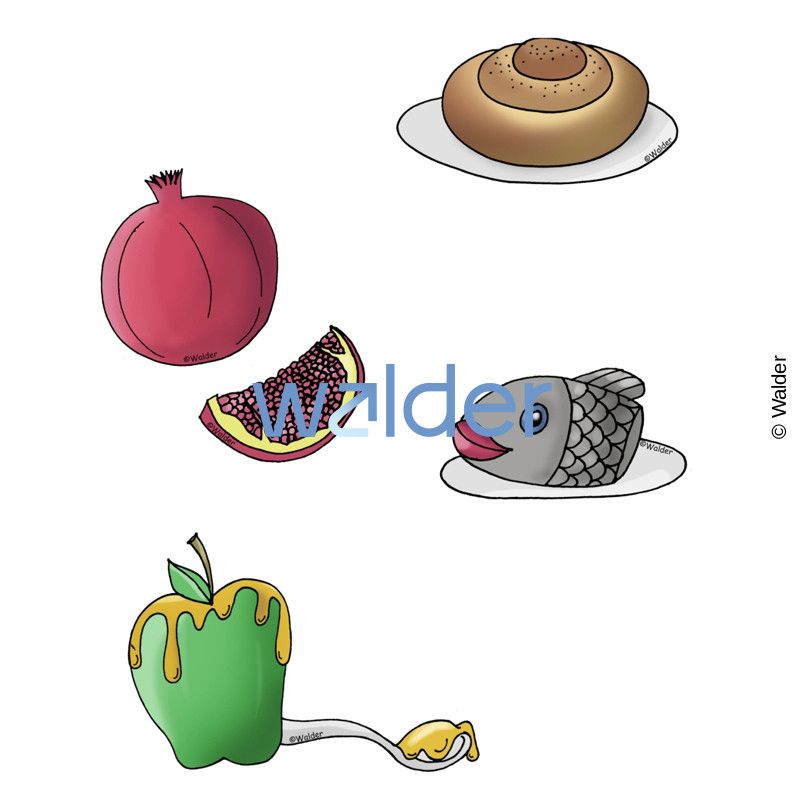 The Walder Education Pavilion brings Jewish education to life with these Yamim Noraim clipart illustrations and images. Dress up the classroom, decorate student pages, and create activities or gifts. These adorable and fun drawings capture the essence of the High Holidays. Pictured: Rosh Hashanah Objects, Round Challah, Head of Fish, Pomegranate, and Apple and Honey