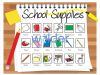 Poster featuring pictures of 18 common school supplies, each depicted in a black square. The name of each item is written below its picture. This poster will help students learn and remember the names of different school supplies.