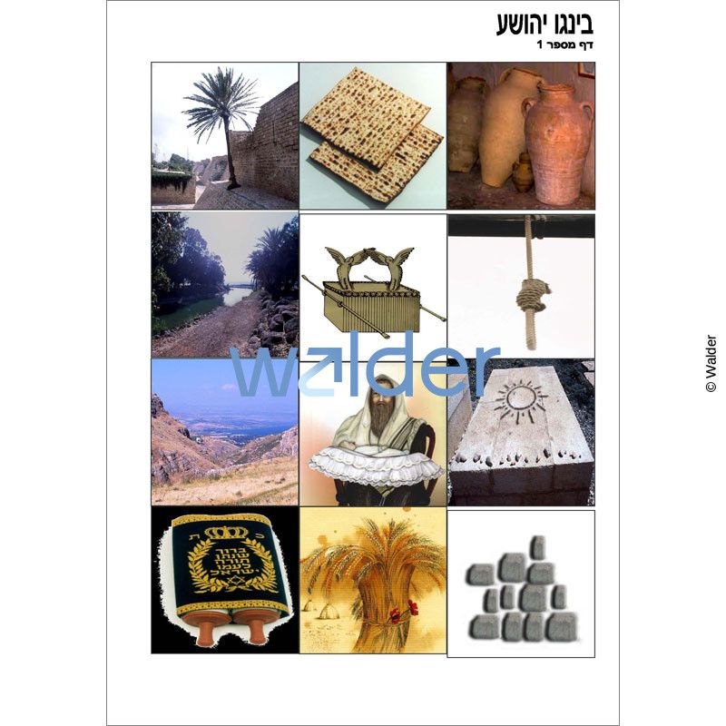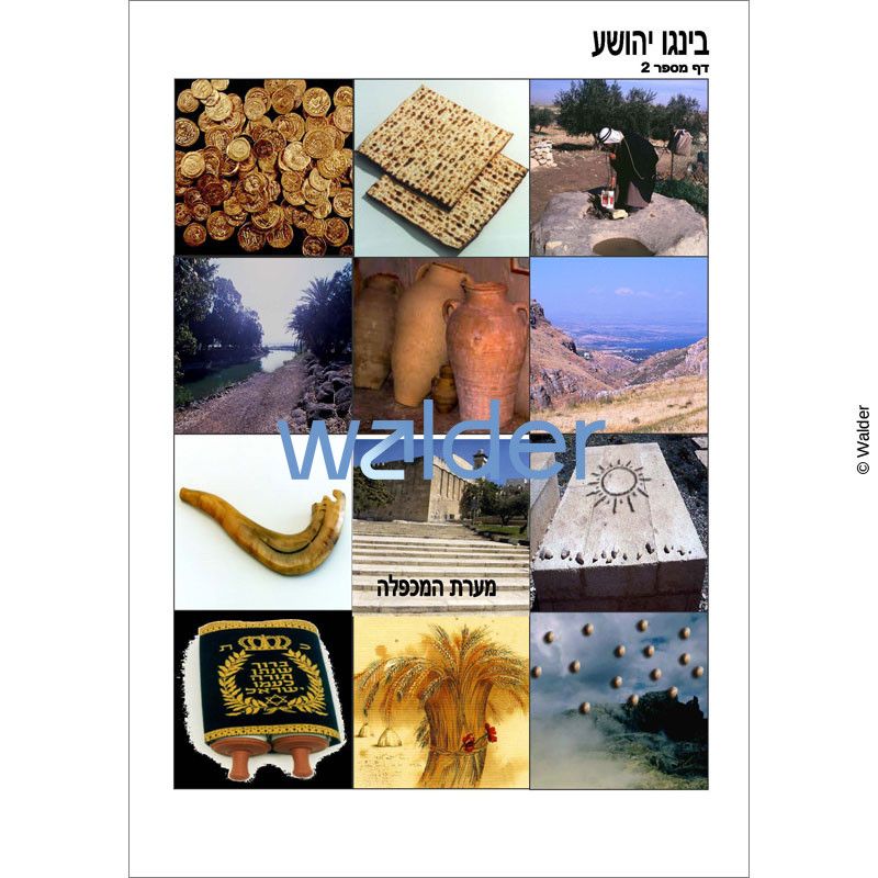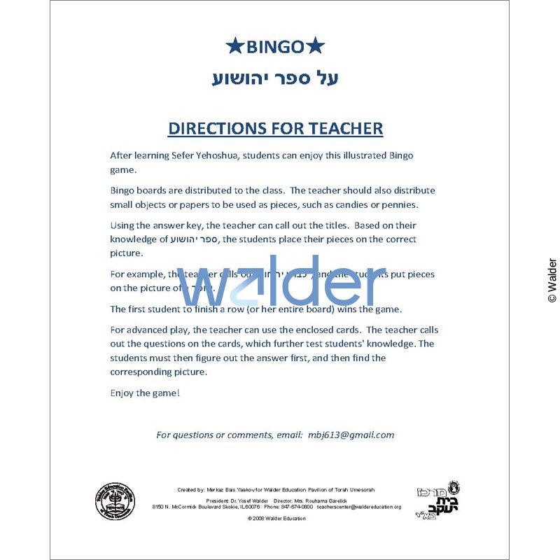 This Bingo game is an excellent visual review of Sefer Yehoshua, in which students will match photographic Bingo cards with events that occurred in Sefer Yehoshua. An addional set of call cards provides a more advanced class with questions that serve as clues to the correct answers.