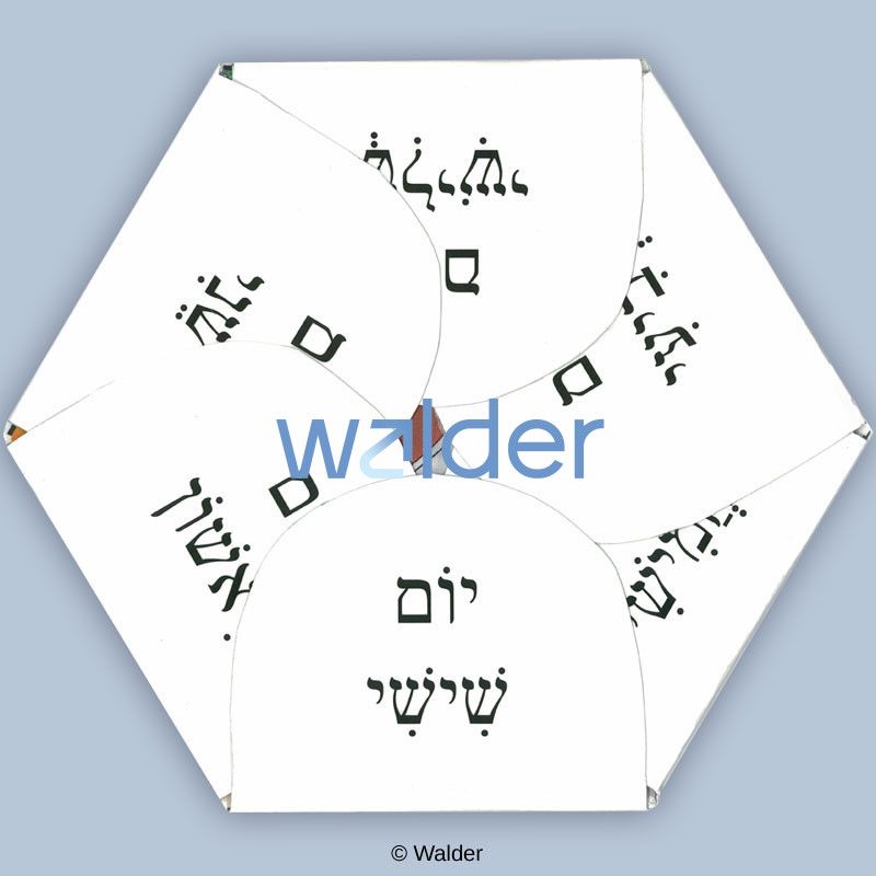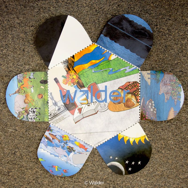 This 3D hexagonal poster is the ideal educational aid to teach the seven days of creation. Each of the six flaps presents an illustration depicting one of the first six days of creation, and the center picture portrays Shabbos.