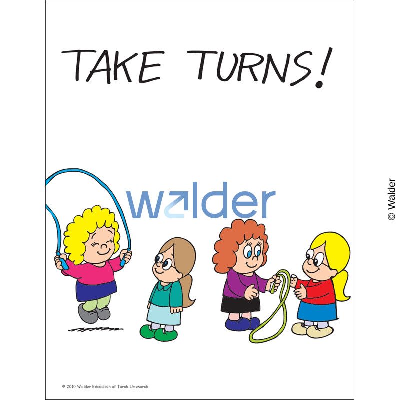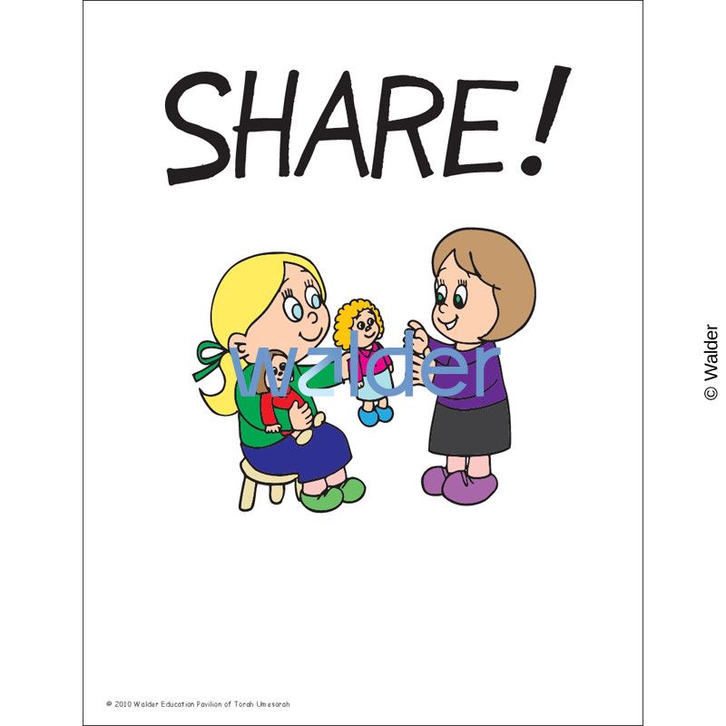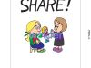 Sign with a picture of two girls, one girl handing the other one of her two dolls. The word ‘Share!’ is in large black letters above.