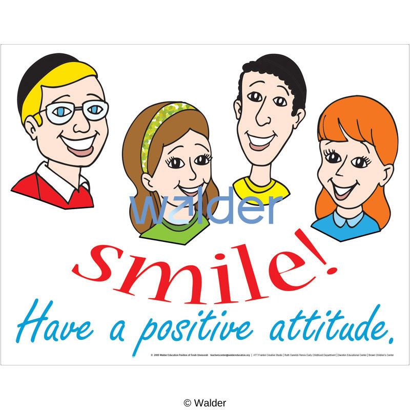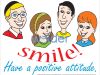 Poster featuring two smiling girls and two smiling boys in different colored shirts over the words ‘Smile! Have a positive attitude.’ on a white background.