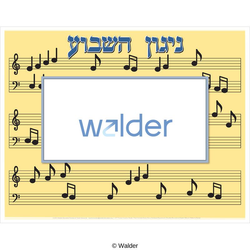 Poster with the words ‘Nigun Hashavuah’ with a white 9″x18″ area to put the name of that week’s song. This can be done in a few different ways. The teacher can write it with a dry erase marker or fit it with a clear pouch made from a piece of lamination or clear plastic. Hanging this poster during the week will build excitement among the students and have them look forward to learning the song and sharing it with their family on Shabbos.