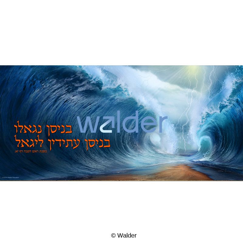 A school-wide banner with a picture of the splitting of the sea and phrase “בניסן נגאלו בניסן עתידין ליגאל” written below. The banner is meant as a visual to express the idea that the גאולה can and should come at any time and especially during ניסן as it says in the mentioned phrase from the גמרא in מסכת ראש השנה.