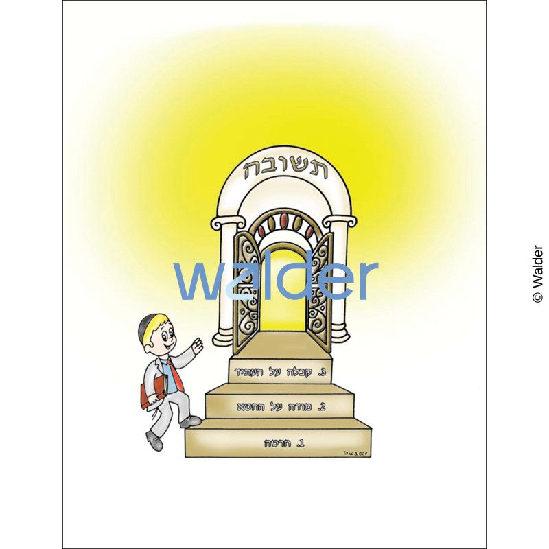 A beautifully colored handout which depicts a boy walking up the steps (named for each step of the Teshuvah process) towards Teshuvah. Possible Uses: Teachers will use this handout as a teaching tool for visual learners. Students will see the �steps� leading toward teshuvah and gain a better appreciation and understanding of the process of Teshuvah.