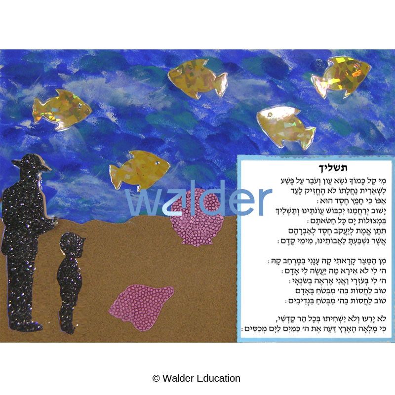 This Tashlich scene with the text of the tefillah is a multisensory project designed using a variety of materials and textures and is great for the tactile learner. It is an attractive yom tov display. (Shaimos Alert)
