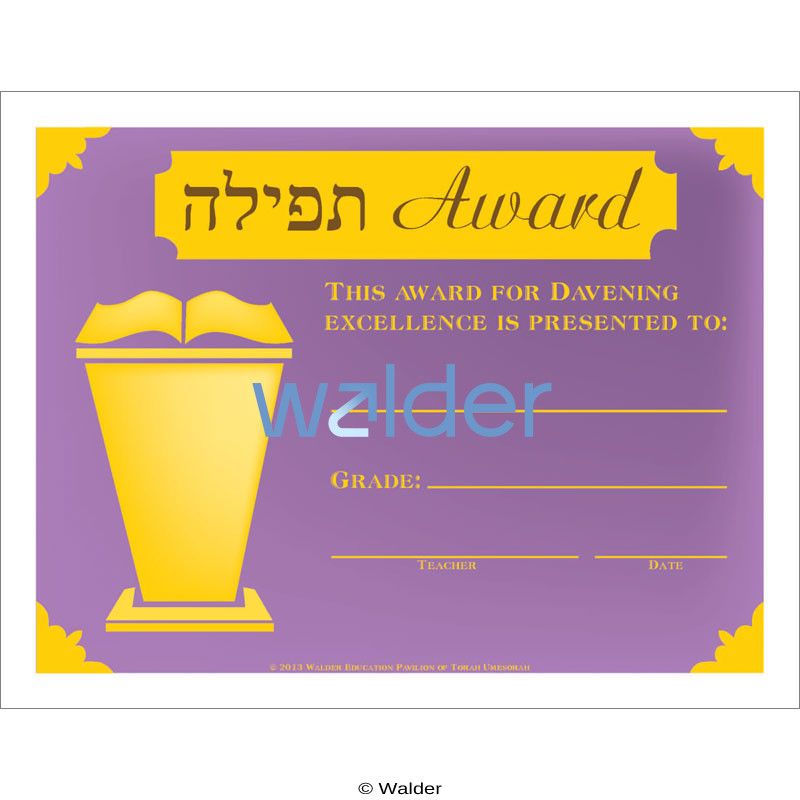 This award can be presented to your students for exemplary davening. The award allows each student to receive individual recognition for his or her performance in tefillah. Upon receiving the award, your students will walk away imbued with a feeling of pride and success.