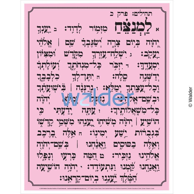 Kapitel Chof, Chapter 20 of Tehillim is commonly said during times of great need. Here the text is enlarged on a poster suitable to hang in the classroom. It can be used to help the students memorize the words or to familiarize them with the text.
