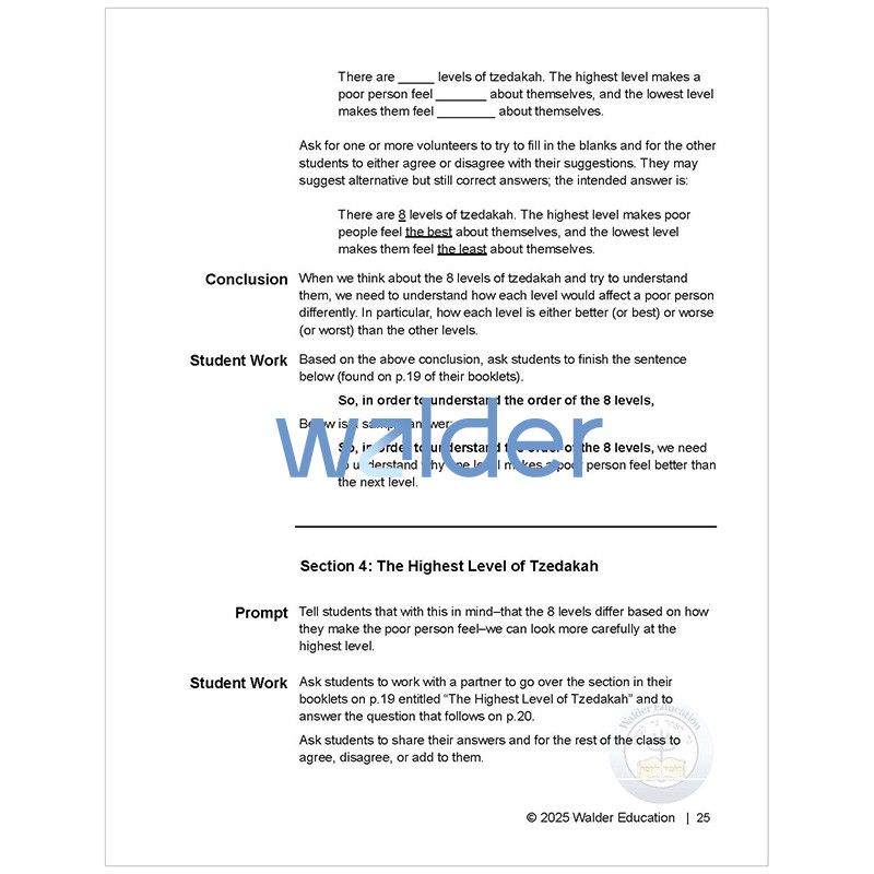 Unit 2 covers the 8 levels of tzedakah, first formulated by the Rambam. Students will develop a deeper sensitivity to others while learning about ways to maximize the dignity of those who receive tzedakah.