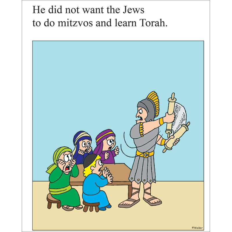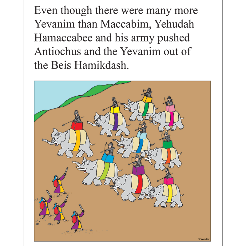 This history of Chanukah depicts all of the events that led to the creation of the holiday. From Antiochus’s evil decrees to the desecration of the Beis Hamikdash and the miracle of the menorah, children will get a glimpse of why Chanukah is celebrated. Difficult words are explained in the accompanying glossary.