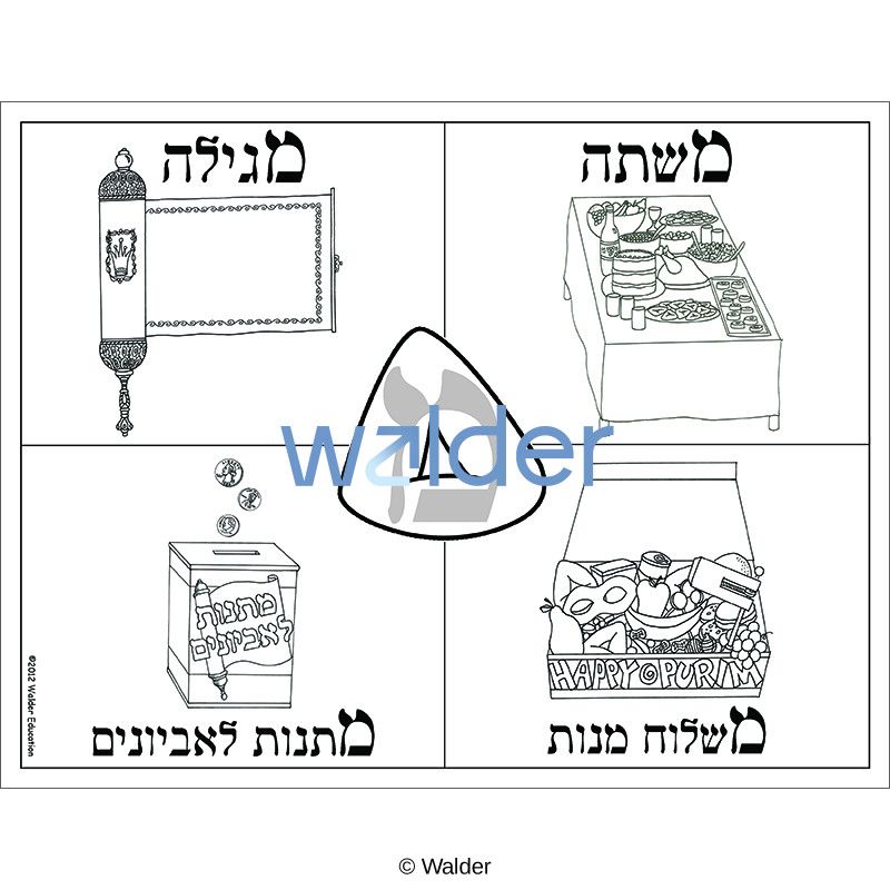 Introduce your students to the basics of Purim with this beautifully illustrated sheet depicting the four Mitzvos of Purim, all starting with the letter Mem: Megilla, Mishte, Matanos Leevyonim and Mishloach Manos. Students can color and use as a decoration for the classroom or home.