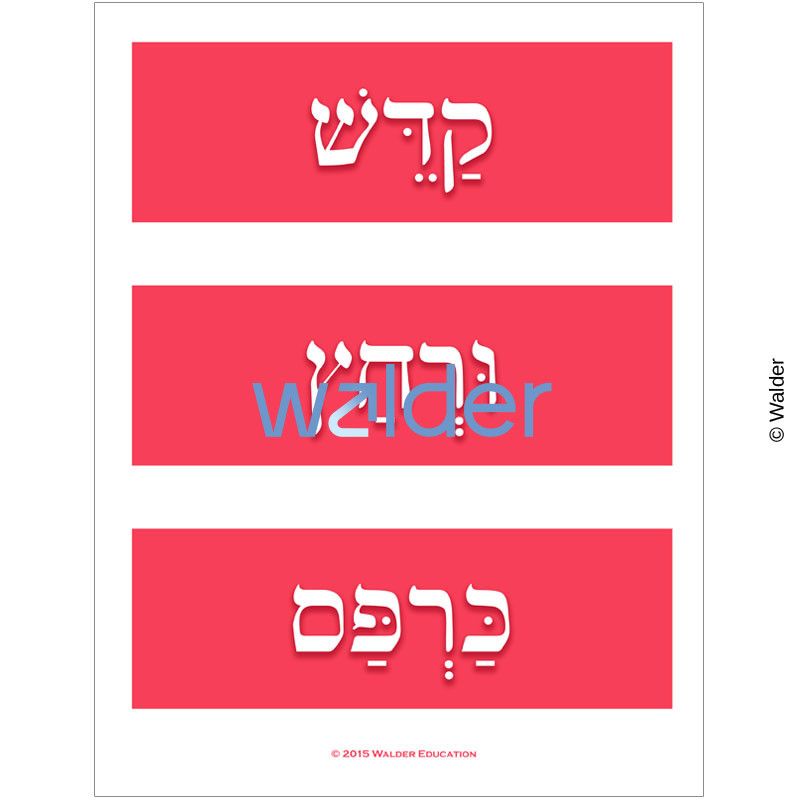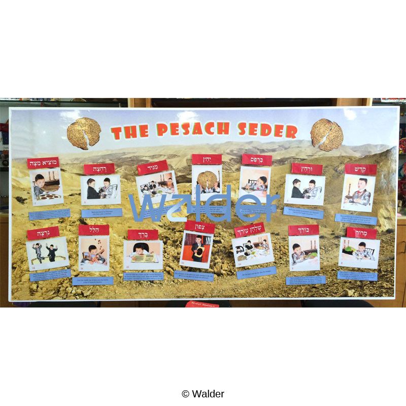 Instill excitement and anticipation in your students as you engage them in learning all the steps of the Pesach Seder. This charming, interactive bulletin board has a matching Haggadah to enhance your Pesach curriculum. The bulletin board can be used as an educational game. Divide your class into teams and have them match the correct name to the picture and explain what is done at each stage. It can also be used as an assessment tool at the end of the class to see if they have mastered the steps.
