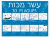 This bilingual poster presents the Ten Plagues in black and white artwork and labels each plague in both Hebrew and English.