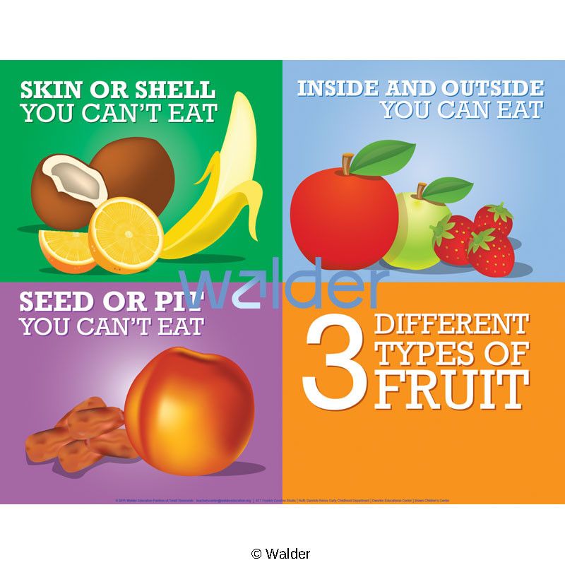 Colorful classroom poster titled,’3 Different Types of Fruit’ with illustrations of three categories of fruit. This poster is suitable for hanging in the classroom and can be used in conjunction with a study unit on Tu B’Shvat or nutrition.