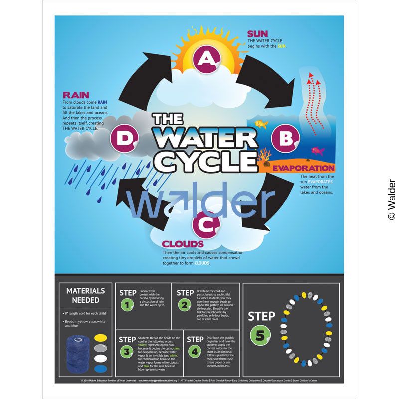 Poster featuring a graphical representation of the four steps to the water cycle: sun, evaporation, clouds, and rain. Included on the bottom of the poster are instructions broken down in 5 clear steps on how to make a water-cycle themed bracelet out of chord and different colored beads.