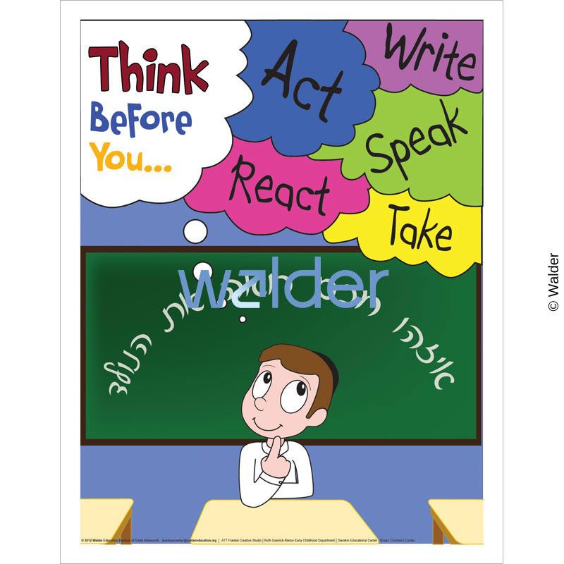 Poster featuring a small girl at a desk in front of a blackboard. A thought bubble coming from her head reads ‘Think before you…’ surrounded by many different colored thought bubbles with words such as ‘act, speak, write…’ etc. The blackboard says ‘????? ??? ???? ?? ?????’ in white script lettering.