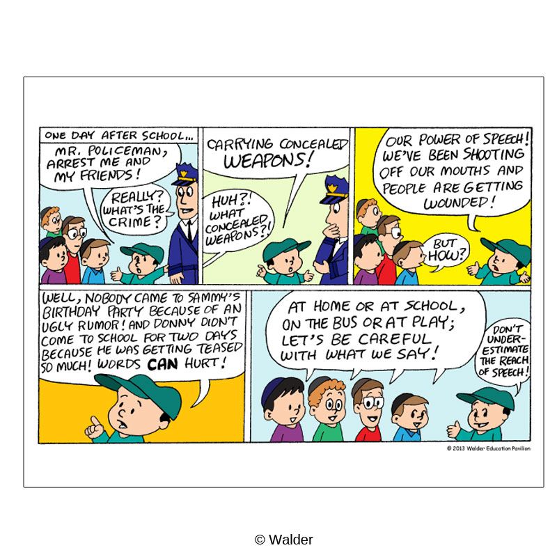 Set the stage for a zero tolerance for bullying classroom by adorning your classroom walls with these entertaining yet powerful posters. These comics act as a springboard to arouse discussion in the classroom, stimulating students to think about and examine the damage caused by bullying and how to eliminate it. Students, either individually or in groups, can write about each poster, demonstrating what the message of the poster is and/or how it can be applied to their lives.
