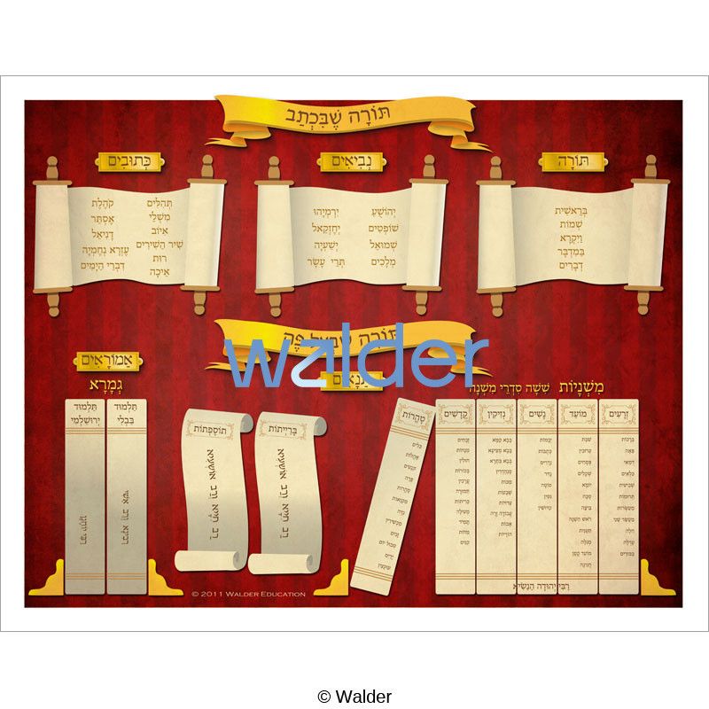 This poster, suitable for hanging in the classroom, features two sections which lists all the books of Tanach, the Written Torah, and all sections of the Oral Torah. Students can use these lists to help familiarize themselves with the names of all the Books of the Torah and to help them memorize the names as well.