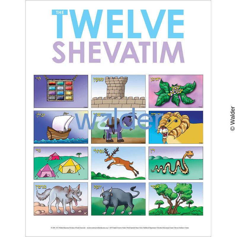Poster featuring the pictures associated with each of the twelve tribes. The pictures are sorted in four rows of three images each. Each picture displays the name of its tribe in gold Hebrew lettering. The title, ‘The Twelve Shevatim’, is at the top in large letters in English.