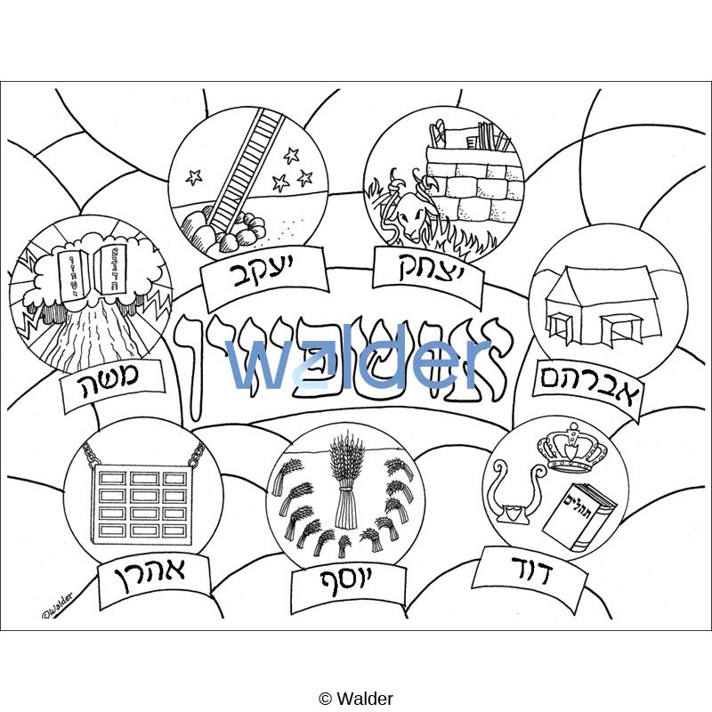 A beautifully illustrated sukkah decoration that has a stained glass effect. Possible Uses: Teachers will copy onto transparency paper (available at office supply stores). Using permanent markers students will color the picture. (allow time for marker to dry in order to prevent smudging) Using inexpensive frames (such as those available at most dollar stores) teachers will cover the frames hard removable backing with tinfoil so it may be visible through the glass. Place the picture on top of foil and cover with the glass and frame for a stained glass look.