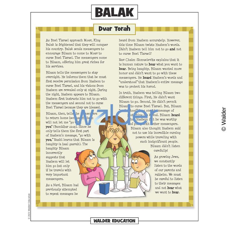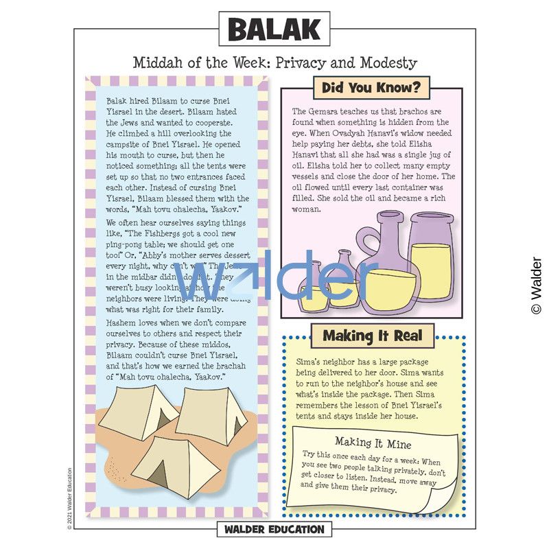 This handout is filled with everything needed to review the weekly parsha at the Shabbos table. It contains a summary of the weekly Torah portion, a middah of the week, and divrei Torah that are sure to engage children of all ages.