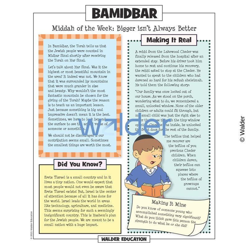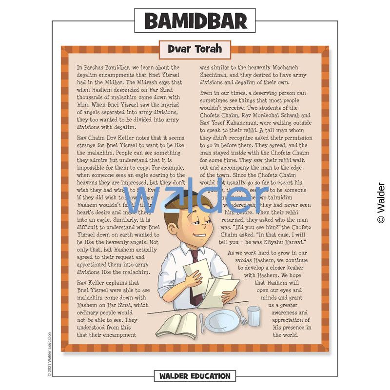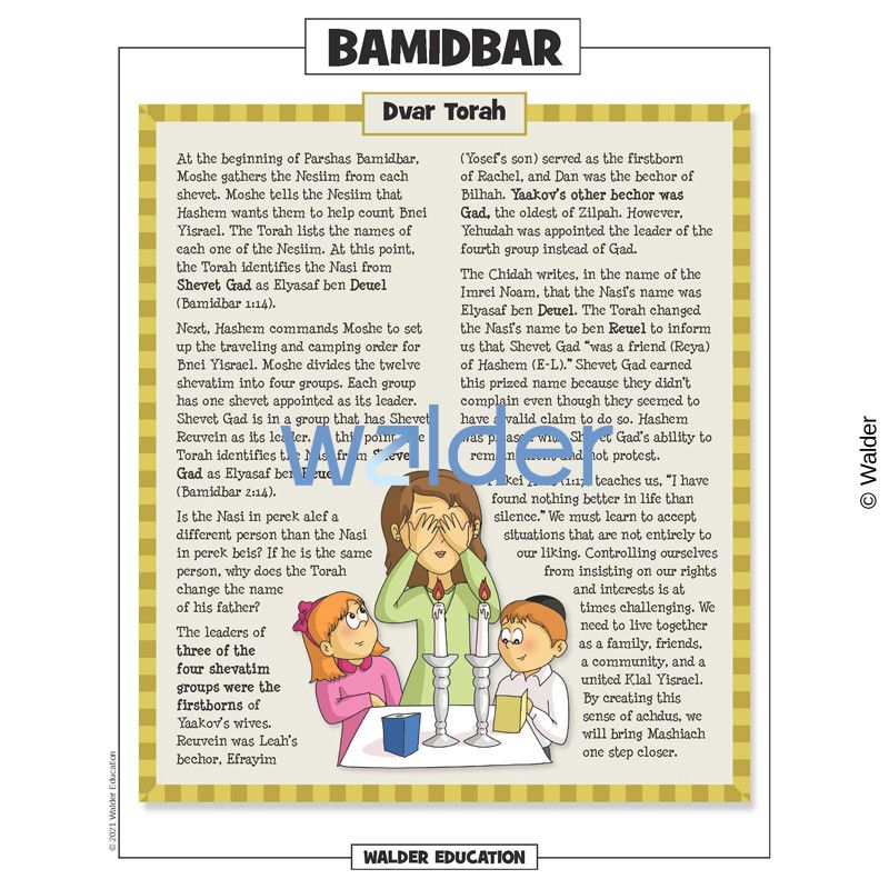This handout is filled with everything needed to review the weekly parsha at the Shabbos table. It contains a summary of the weekly Torah portion, a middah of the week, and divrei Torah that are sure to engage children of all ages.