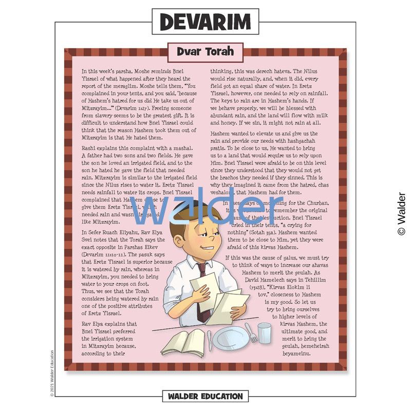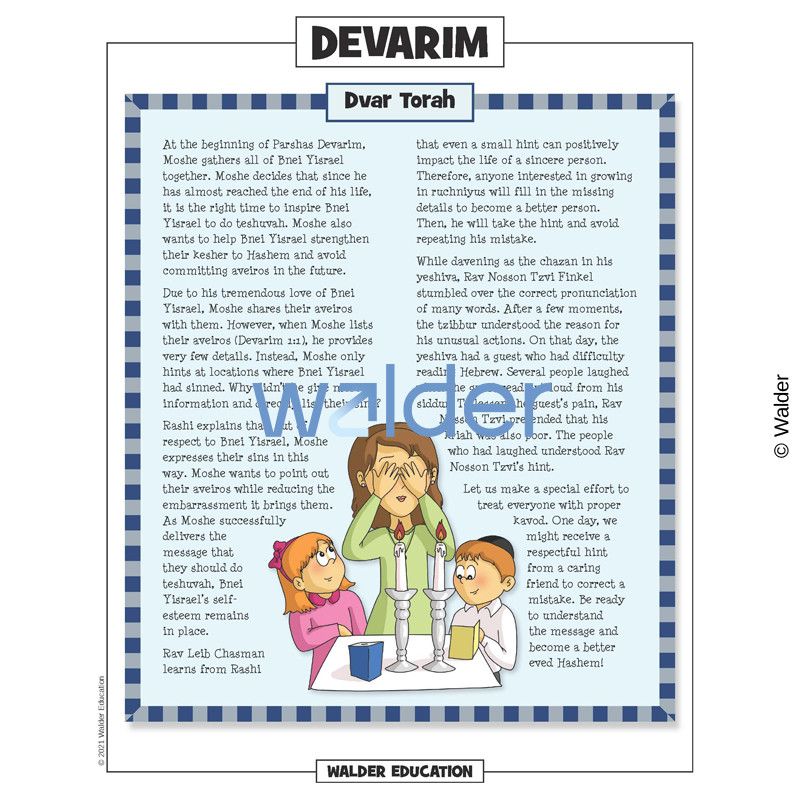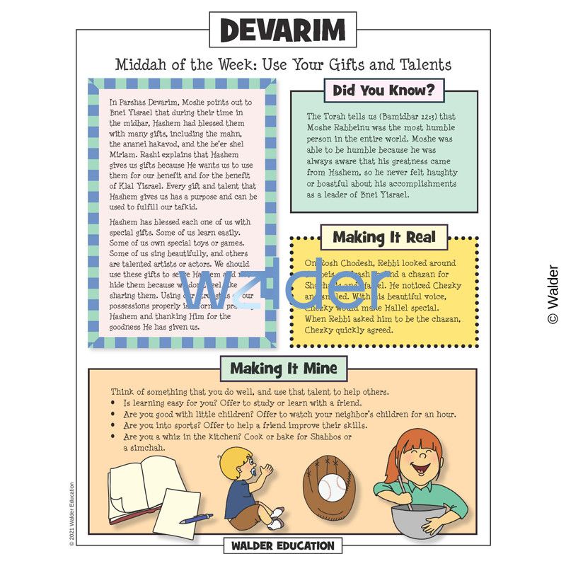 This handout is filled with everything needed to review the weekly parsha at the Shabbos table. It contains a summary of the weekly Torah portion, a middah of the week, and divrei Torah that are sure to engage children of all ages.