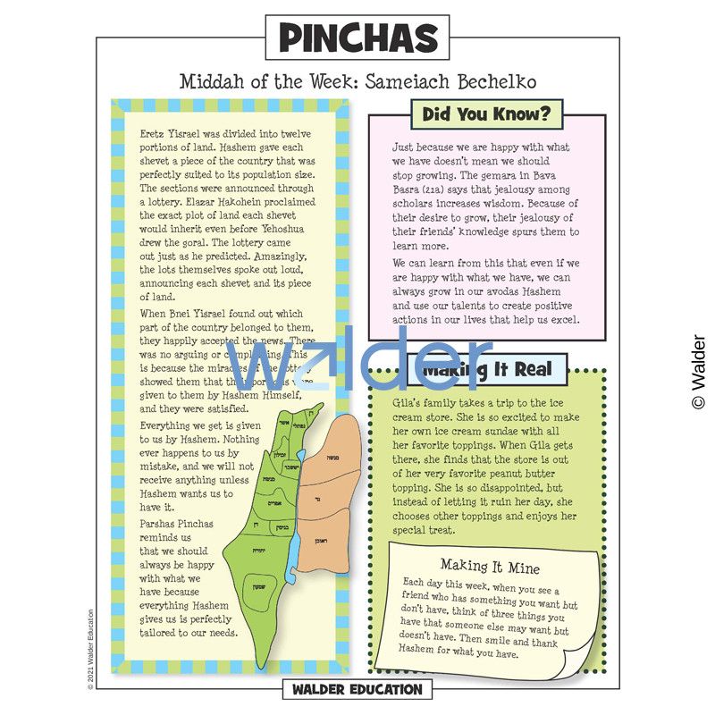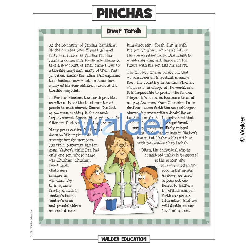 This handout is filled with everything needed to review the weekly parsha at the Shabbos table. It contains a summary of the weekly Torah portion, a middah of the week, and divrei Torah that are sure to engage children of all ages.