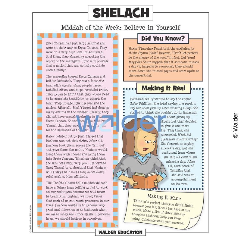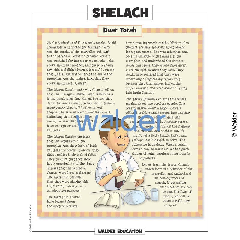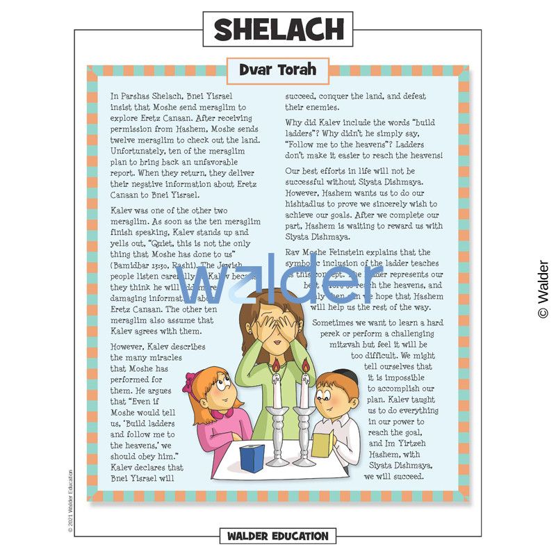 This handout is filled with everything needed to review the weekly parsha at the Shabbos table. It contains a summary of the weekly Torah portion, a middah of the week, and divrei Torah that are sure to engage children of all ages.
